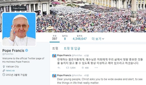 프란치스코 교황은 15일 자신의 트위터에 다섯 번째 한글 트윗글을 남겼다. 그는 “친애하는 젊은이들에게, 예수님은 저희에게 우리 삶에서 정말 중요한 것들을 놓치지 않고 볼 수 있도록 항상 각성하고 깨어 있으라고 하셨습니다”라는 글을 게재했다.