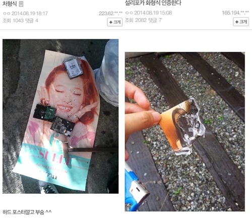 한 팬은 에프엑스 멤버 5명이 있는 사진에서 설리의 모습을 도려냈다. 또 설리의 사진과 영상이 담겨있던 컴퓨터의 하드디스크를 부순 것을 사진으로 찍어 인증하기도 했다. 심지어 설리의 사진을 불로 태우면서 ‘화형식’을 인증했다. 설리의 사진을 가위로 잘라버린 것을 ‘처형식’이라 칭했다. 5년간 에프엑스 팬페이지에서 70만개의 글과 댓글을 남긴 팬도 ‘설리팬 아님’이라고 인증했다.