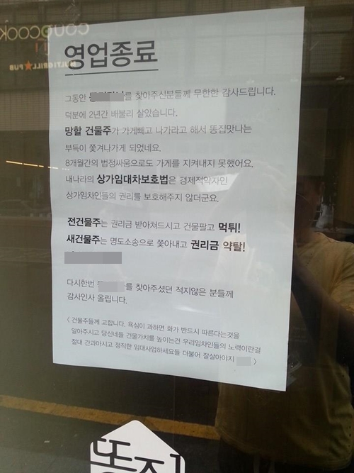 최근 이 음식점의 페이스북 페이지에는 한 장의 사진이 게재됐습니다. 글쓴이는 “감사했습니다. 좋은 경험으로 생각하겠습니다. 억대의 빚이 남았지만. 더 이상 억울하게 쫓겨나는 임차인들이 없었으면 좋겠습니다”고 적었습니다. 글과 함께 음식점 앞에 붙여진 ‘영업종료’ 게시문을 사진 찍어서 올렸습니다.