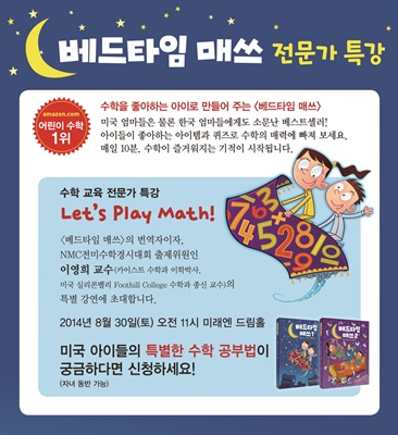 ‘Let’s Play Math’를 주제로 진행되는 이번 강연회에서는 베드타임 매쓰를 활용한 일상 속 수학 교육, 미국 아이들의 STEM 수학 공부법 등 아이들의 수학 흥미를 높이는 방안에 대해 자세히 소개할 예정이다. 강연회 수강 신청은 오는 28일까지 온라인 서점 알라딘(http://blog.aladin.co.kr/culture/7115288)에서 진행할 수 있다.