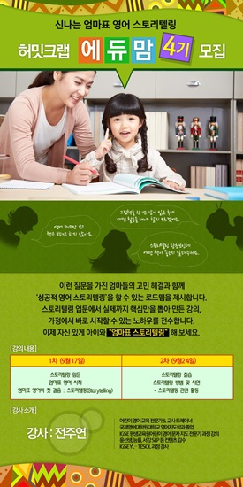 이번 에듀맘 4기에서는 어린이 영어 교육 전문가 전주연 강사를 초빙해 ‘신나는 엄마표 영어 스토리텔링’을 주제로 강의를 진행한다. 엄마표 영어의 첫 걸음인 스토리텔링에 대해 알아보고, 스토리텔링 실습 및 시연 등 가정에서 아이와 함께할 수 있는 영어 스토리텔링 교육법을 다룬다. 참가자 전원에게 에듀맘 4기 교육 수료증을 수여하고 교재 40% 할인 혜택을 제공하며, 강의 리뷰 우수자 3명에게는 상품권도 증정한다.