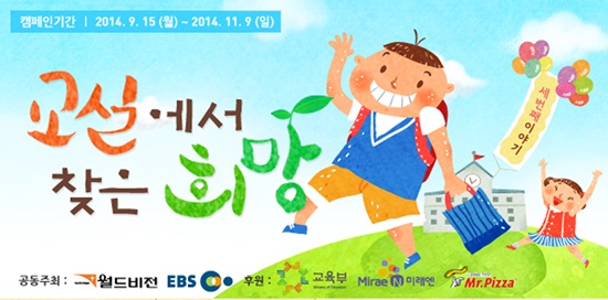 교육출판전문기업 ㈜미래엔(구 대한교과서, 대표 김영진)이 국제구호개발 NGO 월드비전(회장 양호승)과 EBS가 공동 주최하고, 오는 15일부터 11월 9일까지 8주간 진행하는 ‘교실에서 찾은 희망’ 캠페인을 후원한다.