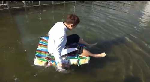 장씨는 “처음에 과자 봉지가 물에 뜨나 안 뜨나 긴가민가 했다. 과자들을 테이프를 이용해서 붙이 다음에 1인용으로 한 번 타봤는데, 진짜 떠서 잘 가더라. 생각보다 되게 튼튼하다”고 전했다.