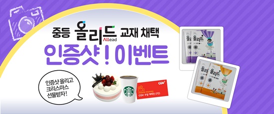 이번 이벤트는 올 한 해 동안 학원 및 공부방에서 중등 올리드를 수업에 활용한 선생님들을 대상으로 감사의 마음을 전하고자 마련됐다. 이벤트 참여 방법은 올리드 선생님 전용 사이트 (www.allead.co.kr)에 자신이 사용하고 있는 중등 올리드 교재 3권을 사진으로 찍어 업로드하면 된다. 선착순 15명에게는 뚜레쥬르 생크림 케익과 CGV 영화 예매권을 제공하며 참가자 전원에게 스타벅스 아메리카노 기프트콘을 증정할 예정이다.