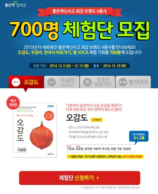체험 교재는 고등 국어 베스트셀러 ‘오감도’와 고등 ‘우공비 사회·과학’, 영어 단어장 ‘별보카’, 한국사 전문 학습서 ‘한국사 바로가기’까지 총 4가지다. 오감도와 우공비, 별보카는 각 200명의 체험단을 모집하며, 한국사 바로가기는 100명을 모집한다. 대상은 중·고등학생으로 해당 학년은 참고서별로 다르다.