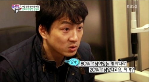 송일국은 “저 같은 경우 녹내장기가 있다”며 “벌써 1년 됐는데 초반에 안약을 넣다 그 뒤로 안과를 못 갔다”고 밝혔다. 검사 결과 시신경의 20% 정도만 남아 있었다.