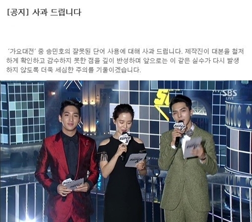 ‘가요대전’ 측은 22일 공식 홈페이지에 “송민호의 적절치 못한 단어 사용에 대해 사과의 말씀을 드립니다”라고 밝혔다.