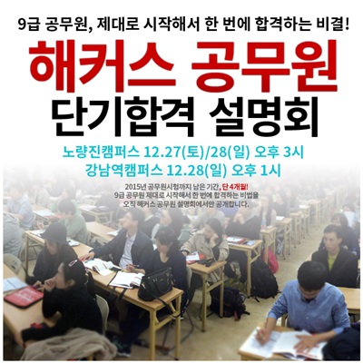 9급 공무원 설명회는 노량진캠퍼스와 강남역캠퍼스에서 진행하며, 노량진캠퍼스에서는 오는 27, 28일 오후 3시, 강남역캠퍼스에서는 28일 오후 1시에 시작된다. 또 7급 공무원 설명회는 27일 오후 3시 강남역캠퍼스에서 이뤄질 예정이다.