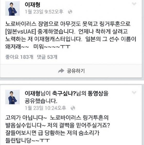 중계가 끝나고 이재형 아나운서는 자신의 페이스북에 “노로바이러스 장염으로 아무것도 못 먹고 링거 투혼으로 ‘일본 vs UAE’전을 중계 했습니다”라며 “고의가 아닙니다. 저의 결백을 믿어 주실거죠?”라고 해명글을 남겼다. 이어 “일본의 그 선수 이름이 왜 저래. 미워”라고 덧붙이기도 했다.