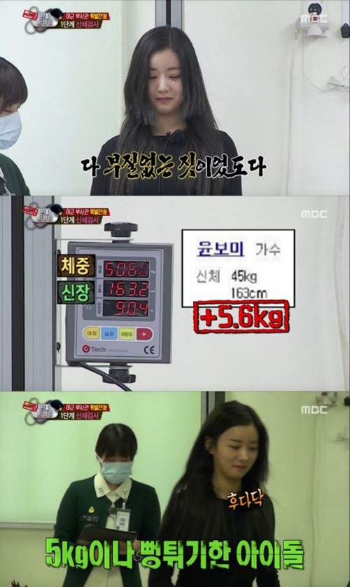 윤보미의 프로필상 실제 키와 몸무게는 163cm에 45㎏이었다. 하지만 측정된 몸무게는 50.6㎏로 무려 5.6kg 차이 난 것이다. 당황한 윤보미는 성급히 자리로 돌아가 웃음을 자아냈다.