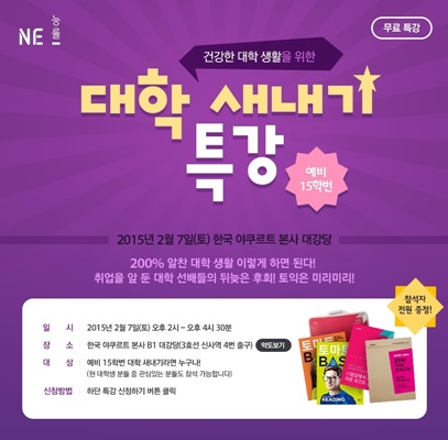 NE 능률이 마련한 대학 새내기 특강은 오는 2월 7일 토요일 오후 2시 서울 잠원동에 위치한 한국야쿠르트 본사 지하 1층 대강당에서 무료로 열린다. 참가신청은 NE Books 고객센터의 세미나 안내 페이지를 통해 선착순으로 접수하며, 예비 대학 새내기를 비롯해 특강 주제에 관심 있는 대학생은 누구나 참석할 수 있다.