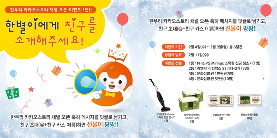 이번 카카오스토리채널 오픈을 기념해 경품 이벤트도 병행한다. 4일부터 9일까지 6일 간 카카오스토리채널에 오픈 축하 메시지를 남기고 댓글에 ‘@’를 눌러 카카오스토리 친구를 초대하면, 추첨을 진행해 미니청소기, 리빙박스, 문화상품권 등 다양한 상품을 증정한다. 당첨자는 11일 한우리 카카오스토리채널에서 발표한다. ivemic@kukimedia.co.kr