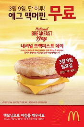 [쿠키뉴스= 이훈 기자] 맥도날드는 오는 9일 맥도날드의 대표 아침 메뉴인 에그 맥머핀(Egg McMuffin)을 무료로 제공하는 ‘내셔널 브렉퍼스트 데이(National Breakfast Day)’를 진행한다.