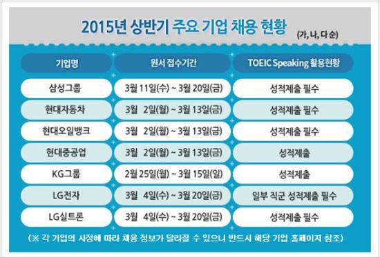 국내 토익 스피킹 주관사인 YBM 한국TOEIC위원회는 최근 발표된 주요 기업의 채용 일정에 맞춰 취업 준비생들이 적시에 토익 스피킹 점수를 취득할 수 있도록 기존 일정에 더해 오는 11일(수)과 18일(수) 평일 시험을 추가 개설한다고 전했다.