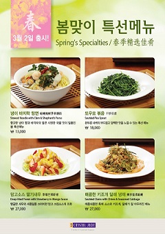이번에 선보이는 봄 특선메뉴는 냉이 바지락 탕면, 매콤한 키조개 달래 냉채, 망고소스 딸기새우 등으로 봄나물의 대명사인 냉이와 달래, 비타민C의 여왕인 딸기를 활용했다.
