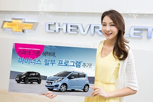 10일 한국지엠에 따르면 3월에 한시적으로 진행되는 마이너스 할부 프로그램을 선택, 쉐보레 스파크를 구입하는 고객은 할부금 납부 시 할부 원금의 1%에 해당하는 이자를 돌려받는다.