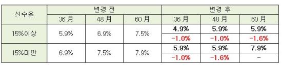 10일 현대차에 따르면 원리금 균등납부 방식으로 현대차를 구입하는 고객이 선수금 15% 이상을 납부할 경우 기존 5.9%(12/24/36개월) 금리가 4.9%로 6.9%(48개월)는 5.9%로 7.5%(60개월)는 5.9%로 평균 약 1%P 할부금리가 인하된다. 3월 2일부터 구매한 고객에게 소급 적용된다.
