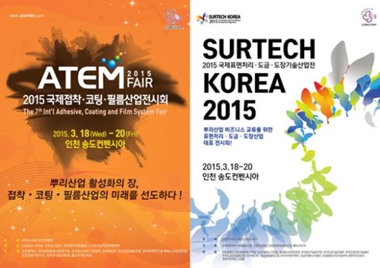 [쿠키뉴스=김성일 기자] 접착·코팅·필름산업의 최신 기술과 시장 동향을 한눈에 조망할 수 있는 국내 최대 전문 전시회인 ‘2015 국제접착·코팅·필름산업 전시회(ATEM FAIR 2015)’와 표면처리 산업 전문 전시회 ‘2015 국제표면처리·도금·도장기술산업전(SURTECH KOREA 2015)’가 인천 송도 컨벤시아 전관에서 18일 동시 개최돼 20일까지 행사를 이어간다.