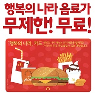 카드를 소지한 고객은 오는 25일부터 내달 30일까지 맥도날드에서 판매되는 모든 버거 또는 머핀 단품을 구매하면 구매영수증 1장당 탄산음료, 프리미엄 로스트 원두커피, 아이스 커피와 같은 행복의 나라 메뉴 음료 1잔을 무료로 받을 수 있다.