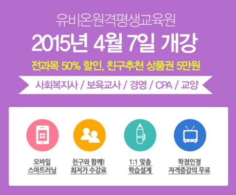 유비온 원격평생교육원에서는 현재 경영학 학위과정, CPA 선수학점 이수과정, 교양과정, 보육교사 자격취득과정, 사회복지사 자격취득과정 등이 4월 7일 개강을 앞두고 있다. 모바일 스마트러닝 서비스의 인기에 힘입어 수강상담이 밀려들자 교재 무료증정, 수강료 할인 등 혜택의 내용을 더욱 확대했다.