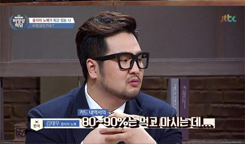 [쿠키뉴스=이혜리 기자] 가수 김태우가 카드값의 90%는 먹고 데 쓴다고 털어놨다.