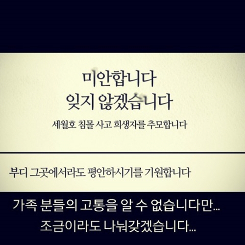 사진에는 ‘미안합니다. 잊지 않겠습니다. 세월호 침몰 사고 희생자를 추모합니다. 부디 그곳에서라도 평안하시기를 기원합니다. 가족 분들의 고통을 알 수 없습니다만 조금이라도 나눠 갖겠습니다’라는 문구가 담겼다.