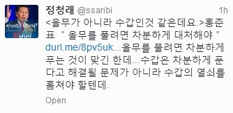 그는 트위터에 “이완구 총리는 정치자금법 혐의보다 거짓말 논란에 따른 국민정서법 위반혐의가 더 무겁다”며 “박 대통령은 대국민사과없이 엉뚱하게 정치개혁을 말한다. 자기개혁부터 하라. 꼬리에 꼬리를 무는 댁들(꼬꼬댁)의 거짓말에 국민들은 질렸다”고 적었다.