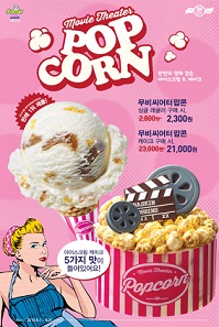 5월 이달의 맛 ‘무비씨어터팝콘’은 고소한 팝콘 아이스크림에 바삭함을 더해주는 크런치 팝콘과 풍미를 더해주는 솔티 카라멜 리본이 어우러진 제품이다. 권장소비자가격은 싱글레귤러 기준 2800원.