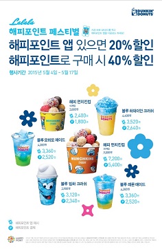 [쿠키뉴스=이훈 기자] 던킨도너츠는 해피포인트로 구매 시 40%, 해피포인트 앱 제시 시 20% 할인해주는 ‘해피포인트 페스티벌’을 오는 17일까지 진행한다.