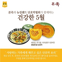 [쿠키뉴스=이훈 기자] 죽 전문점 본죽은 뉴질랜드 단호박 협회와 함께, 건강한 5월을 주제로 건강식품인 단호박을 알리는 이벤트를 준비했다고 11일 밝혔다.
