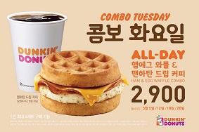 5월 한 달간 매주 화요일(12일, 19일, 26일)에는 ‘콤보화요일’ 프로모션을 진행한다. ‘햄에그 와플 콤보’를 정상가보다 900원 저렴한 2900원에 맛볼 수 있다.