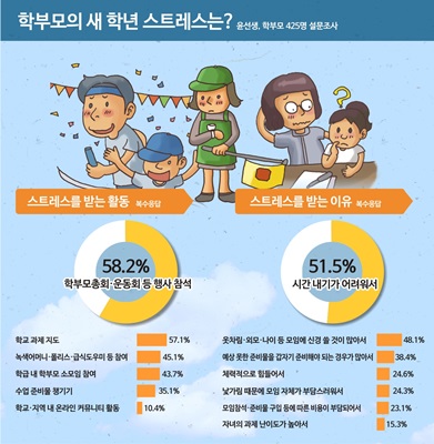 [쿠키뉴스=김성일 기자] 새 학년을 맞은 학부모들은 자녀의 과제 및 준비물 챙기기, 학부모 총회 등 각종 활동으로 인해 스트레스를 받는 경우를 적지 않게 경험하고 있는 것으로 나타났다.