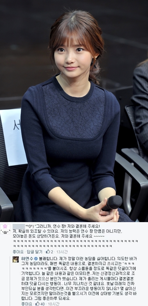 지난달 31일 한 네티즌은 하연수가 자신의 페이스북에 올린 게시물에 “연수 짱! 저와 결혼해 주세요! 저 확실히 외조할 수 있어요. 저의 능력은 연수 짱 만큼은 아니지만 모아놓은 돈도 상당하거든요. 저와 결혼해 주세요”라는 댓글을 달았다.