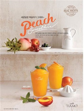 이번에 출시되는 카페띠아모의 ‘프리미엄 피치스무디’는 과일원액 99%에 얼음만 갈아 넣은 천연 과일 스무디 제품이다.