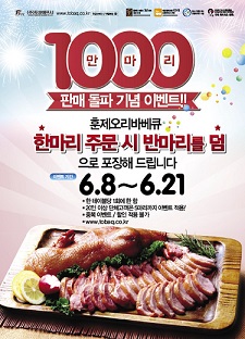 [쿠키뉴스=이훈 기자] 참나무 바비큐전문점으로 시작한 옛골토성은 지난 5월 기준으로 훈제오리 1000만 마리 판매를 돌파했다고 5일 밝혔다. 이에 옛골토성 청계산점을 포함해 모든 가맹점에서 오리 한 마리를 주문하면 반 마리를 덤으로 포장해주는 이벤트를 실시한다. 기간은 오는 8일부터 21일까지 2주간이다.