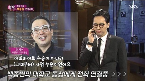 이날 방송에서 이기수 씨는 “대학시절 백종원 씨는 어떤 사람이었냐”는 한희준의 질문에 “괴짜로 유명했다. (여름에는)가죽 점퍼 입고, 저녁에도 선글라스 끼고. 얼굴만 봐도 웃고 시작하는 그런 친구였다”고 털어놨다.
