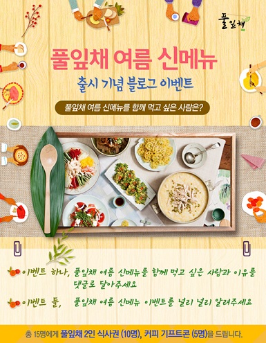 풀잎채는 여름 신메뉴 출시를 기념해 SNS 이벤트를 진행한다. 풀잎채 공식 블로그에 ‘풀잎채 여름 신메뉴를 함께 먹고 싶은 사람’을 댓글로 남기면 추첨을 통해 풀잎채 2인 식사권 및 커피 기프트콘 등 푸짐한 상품을 증정한다. 이벤트 참여 기간은 오는 29일까지이며 당첨자 발표는 7월 1일이다.