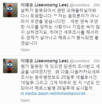 이 대표는 서울지방국세청 조사4국 조사관들이 다음카카오 세무조사를 실시한 것으로 알려진 16일 자신의 트위터에 “정상적 경제활동을 앞장서는 국세청이네요”라는 글과 함께 박근혜 대통령 발언과 세무조사 관련 기사를 링크했다. 박 대통령의 발언은 “과도한 불안심리 확산을 차단하면서 정상적 경제활동을 조속히 복원시킬 수 있도록 하는 것도 중요하다”는 내용이다.