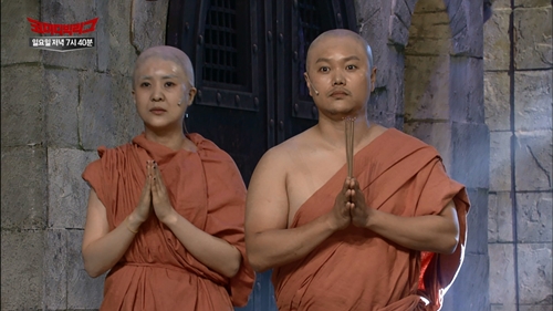 지난 14일 방송된 ‘코미디 빅리그’의 ‘깝스’ 코너에서는 개그맨 강유미, 조세호, 김민교가 등장해 태국의 승려와 불상으로 분장했다.