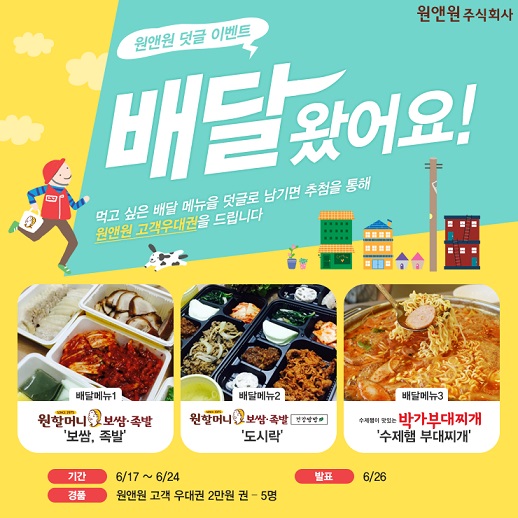 배달메뉴 3종은 ▲‘원할머니보쌈·족발’의 ‘보쌈과 족발’메뉴 ▲‘원할머니 보쌈·족발 건강쌈밥’의 ‘도시락’ ▲‘박가부대찌개’의 ‘수제햄부대찌개’가 있으며 이들 메뉴 중 하나를 선택해 댓글을 남기면 된다.