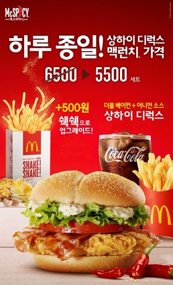 행사 기간 동안 맥도날드 매장을 방문하는 모든 고객들은 기존 6500원에 판매되던 맥스파이시 상하이 디럭스 세트를 하루 종일 맥런치 가격인 5500원에 즐길 수 있다. hoon@kukinews.com