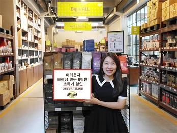 특히 어라운지 블렌딩 원두 ‘리프레시 브라운(1만2000원 상당)’을 6000원에 판매한다. 고소한 견과류 향과 깔끔한 단맛의 조화가 특징이며 쓴맛과 신맛의 밸런스가 좋은 제품이다. 또한 스페셜티 커피 브랜드 ‘메트로폴리스 커피 컴퍼니 슈웨이크 블렌드’로스팅 원두를 77%할인한다.
