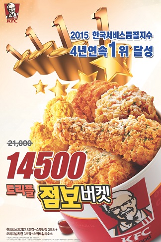 [쿠키뉴스=이훈 기자] KFC는 '2015 한국서비스품질지수' 평가에서 4년 연속 패스트푸드 부문 1위 수상을 기념하는 고객 감사 프로모션을 진행한다.