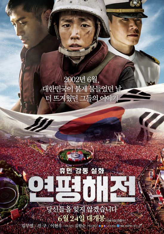 지난 24일 개봉한 ‘연평해전’은 2002년 6월 29일 오전 서해 북방한계선(NLL)에서 대한민국 해군 함정과 북한 경비정이 해상 전투를 벌인 실화를 소재로 만들어졌다. 월드컵 기간에도 고된 훈련을 이어가던 참수리 357호 대원들이 한국과 터키의 월드컵 3, 4위 경기가 벌어지던 날 북한군의 포격을 맞으며 벌어지는 전투를 다루고 있다. 김학순 감독이 연출을 맡았고 배우 김무열, 진구, 이현우가 출연했다.