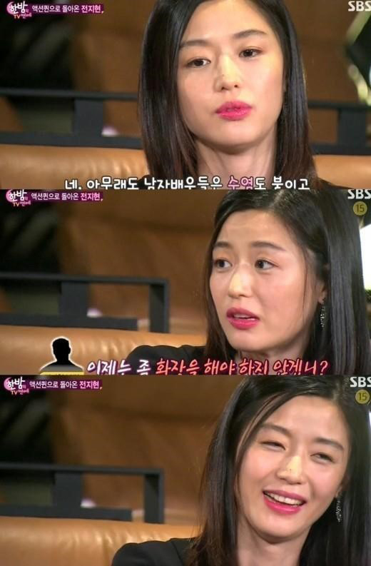 [쿠키뉴스=이준범 기자] 배우 전지현이 SBS ‘한밤의 TV연예’와의 인터뷰에서 자신의 화장에 대한 남편의 반응을 전했다.