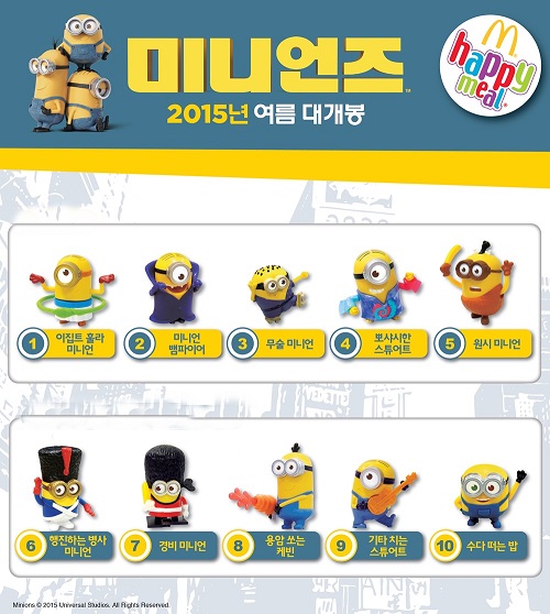 한편 오는 8월 9일 오후 3시부터는 또 다른 5종의 미니언 토이로 구성된 2차 미니언 해피밀 스페셜 세트가 마찬가지로 매장당 100개씩 한정 수량으로 판매되며 10일 자정부터는 2차 일반 미니언 해피밀 세트가 판매될 예정이다. hoon@kukinews.com