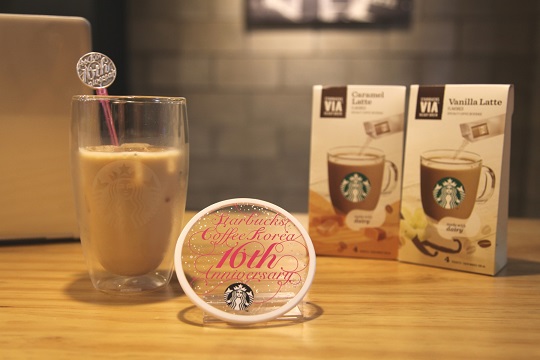 이번 이벤트에서는 ‘스타벅스 비아 캐러멜 라떼’ ‘스타벅스 비아 바닐라 라떼’ ‘스타벅스 비아 카페 모카’ 등 3종류의 비아 라떼 중 2개를 동시에 구입하면 16주년을 기념해 특별히 선보이는 머들러 혹은 코스터를 증정한다.