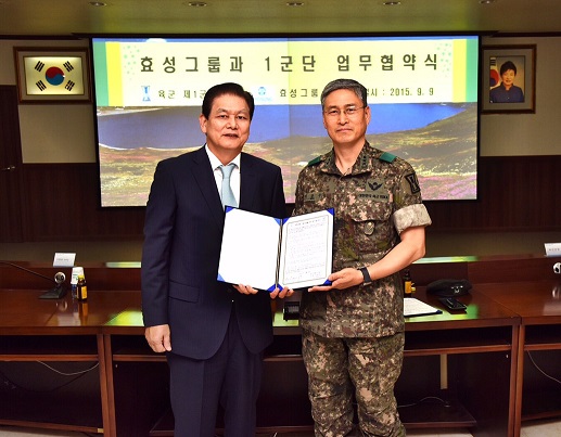 효성은 9일 전투영웅 기념 사업을 위한 업무협약(MOU)을 체결했다. 이날 협약식에서 효성은 장병들이 DMZ 수색작전에 참여했던 모습을 재현한 기념공원 조성 비용으로 2억원을 후원하기로 했다.