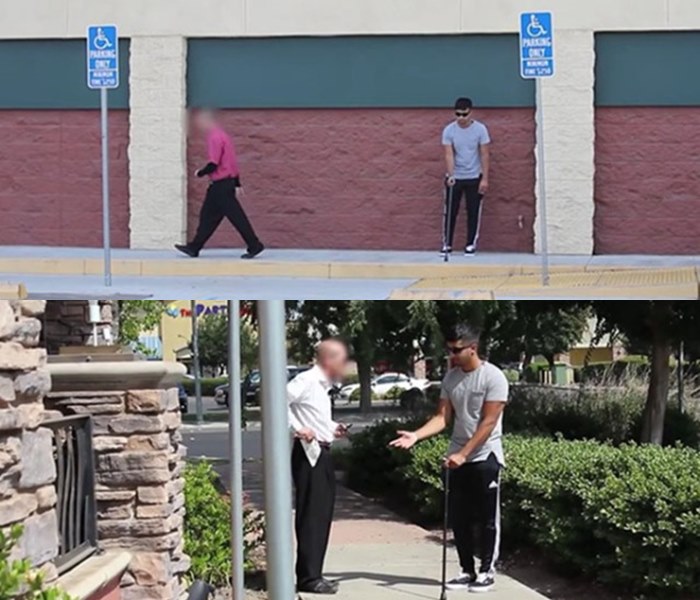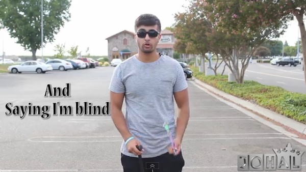 선글라스를 끼고 지팡이를 짚으며 '시각장애인'으로 변장한 조할이