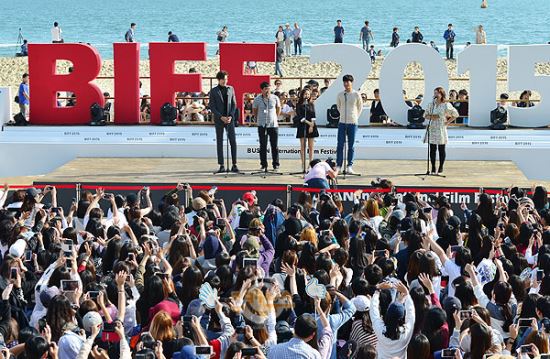 [쿠키뉴스=박효상 기자(부산)] 배우 이광수와 권오광 감독, 배우 박보영, 이천희이 3일 오후 부산 해운대 비프빌리지에서 열린 영화 ‘돌연변이’ 야외무대인사에서 관객과 즐거운 시간을 보내고 있다.